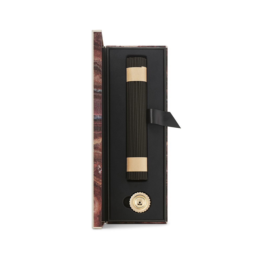 Place the stick in the holder and light the end. Allow flame to catch. Extinguish flame by blowing gently wile continuing to let it smolder.