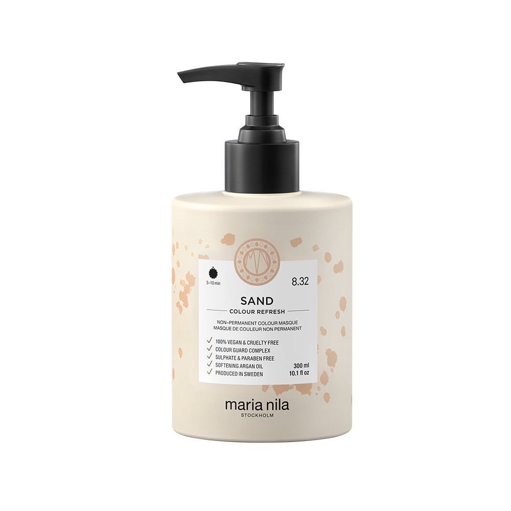 Maria Nila is leading the way for sustainable hair care. The Colour Refresh Sand is a nourishing colour bomb masque with non-permanent colour pigments that will quickly freshen up your hair and bring out sandy tones. Argon all reduces frizz and moisturises the hair for silky results. Colour stayed for about 4-10 washes dependant on the colour and quality of your hair.