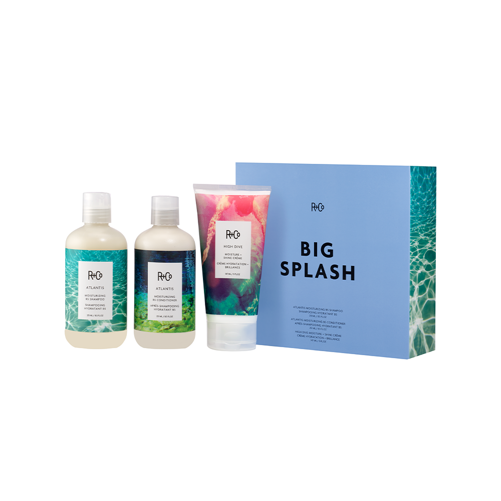 R+Co Big Splash Kit dives deep into hydration for silky, nourished hair. Featuring ATLANTIS Moisturizing Shampoo & Conditioner to replenish and restore, this set makes waves with HIGH DIVE Moisture + Shine Crème, leaving hair smooth, frizz-free, and full of radiant shine.